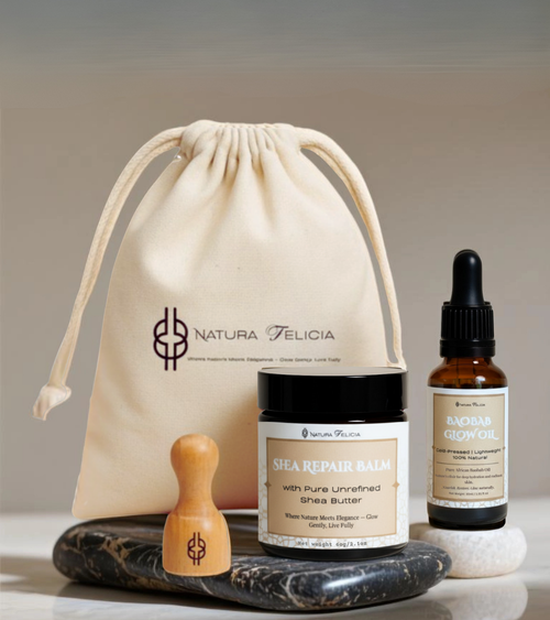 A two-step African glow ritual with raw Shea Butter and cold-pressed Baobab Oil.